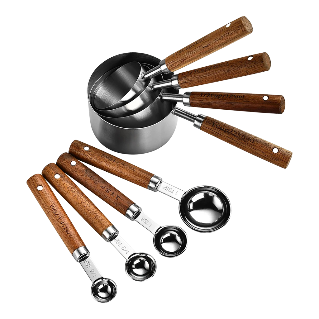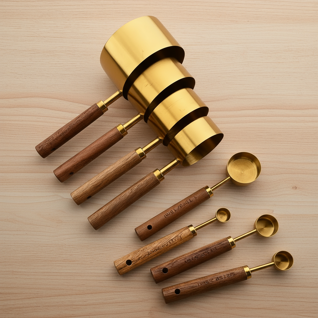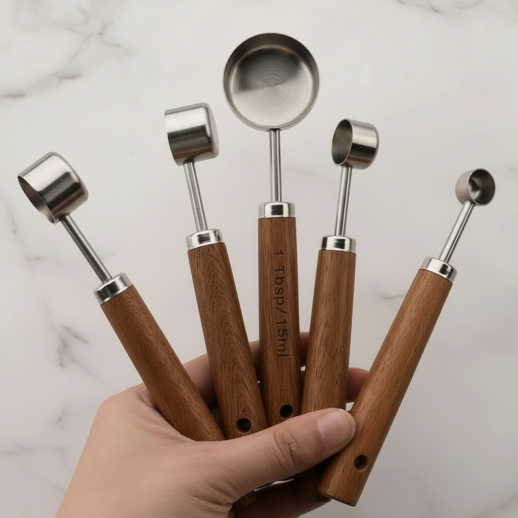 🥄 Conjunto de Medidores em Aço Inox e Cabo de Madeira – Precisão e Elegância na Sua Cozinha