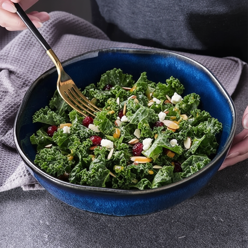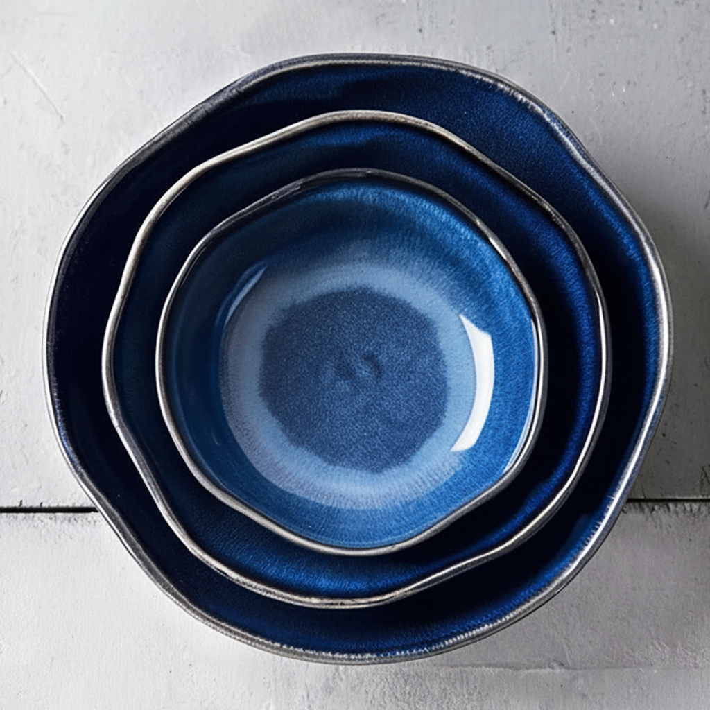 Cada tigela é pintada à mão, com padrões em azul degradê, criando uma estética natural e elegante — nenhuma peça é exatamente igual à outra. -